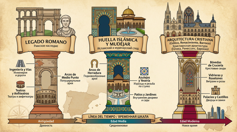 Испанская архитектура стоит на трёх китах, каждый из которых мог бы утопить любую другую страну в культурной перегрузке. Первый кит — мавританское наследие, оставленное восемью веками исламского присутствия на Пиренейском полуострове. Второй — готика, принесённая христианскими королевствами в период Реконкисты. Третий — каталонский модернизм, взорвавший архитектурный мир на рубеже XIX-XX веков. Эти три стиля не просто сосуществуют — они ведут между собой вечный диалог, иногда спорят, иногда заимствуют друг у друга приёмы.