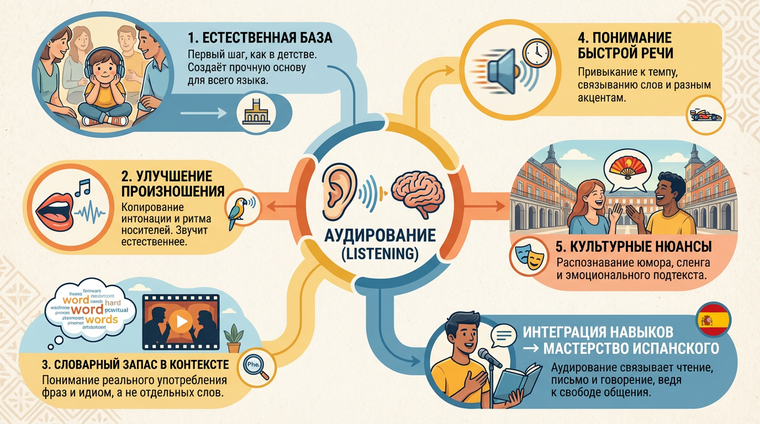 Аудирование — это не просто "послушать испанский". Это тренировка мозга распознавать звуковые паттерны, различать интонации, понимать контекст даже тогда, когда вы не расслышали половину слов. Когда вы регулярно слушаете испанскую речь, происходит магия: ваш мозг начинает автоматически выделять знакомые структуры, предугадывать окончания фраз, распознавать новые слова по контексту.