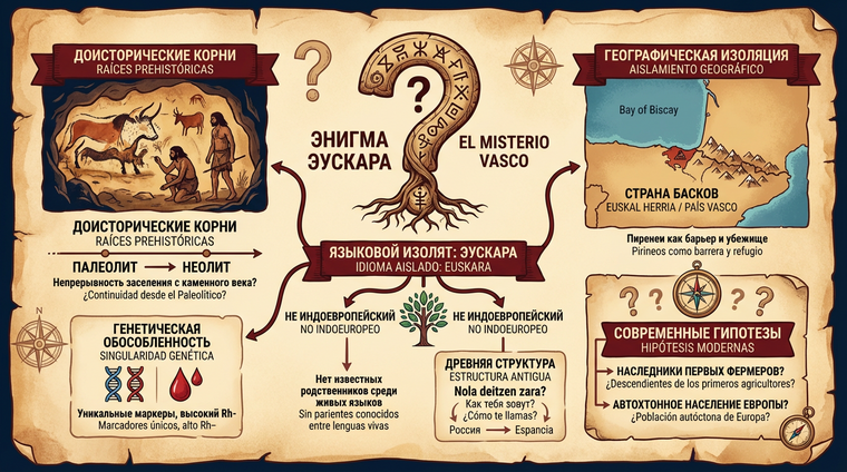 Знаете ли вы, что в сердце Европы, зажатый между Испанией и Францией, существует народ, чей язык не имеет родственников на всей планете? Баски — это не просто этническая группа с богатой историей, это лингвистическая загадка, которая до сих пор ставит в тупик учёных. Пока вся Европа говорит на индоевропейских языках, баски упрямо сохраняют эускару — язык, который существовал задолго до прихода римлян. Их культура — это микс древних традиций, спортивных страстей и гастрономических откровений, которые формируют уникальную идентичность региона. Если вы думали, что знаете Испанию, познакомившись с фламенко и корридой, приготовьтесь к открытию: Страна Басков — это совершенно другая вселенная 🌍