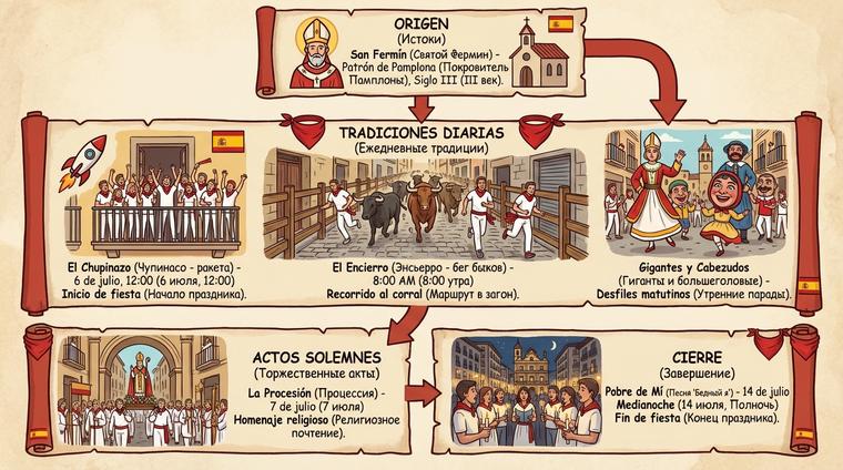 Ключевые традиции включают txupinazo — официальное открытие праздника 6 июля в полдень, когда с балкона ратуши запускают ракету под крики тысяч людей "¡Viva San Fermín!" (Да здравствует Сан-Фермин!). Закрывается праздник 14 июля в полночь песней Pobre de mí (Бедный я), когда участники со свечами прощаются с фиестой до следующего года.