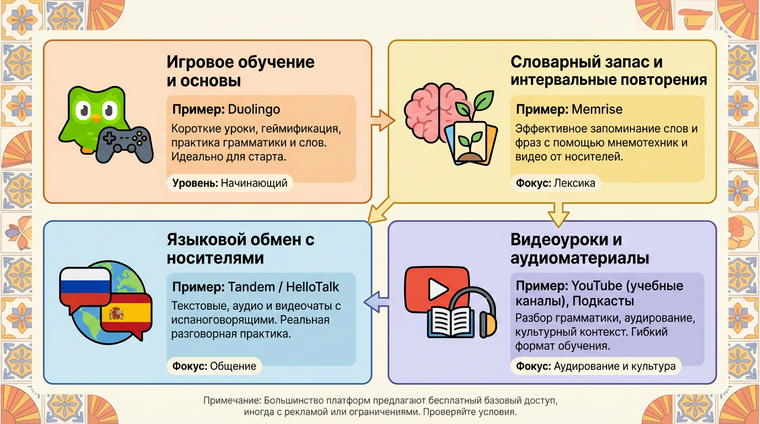 Ключевой момент: используйте эти платформы комплексно. Duolingo для ежедневной рутины, Memrise для пополнения словаря, Busuu для письменной практики, SpanishDict как справочник. Такой подход даст вам прочную основу для дальнейшего роста 💪
