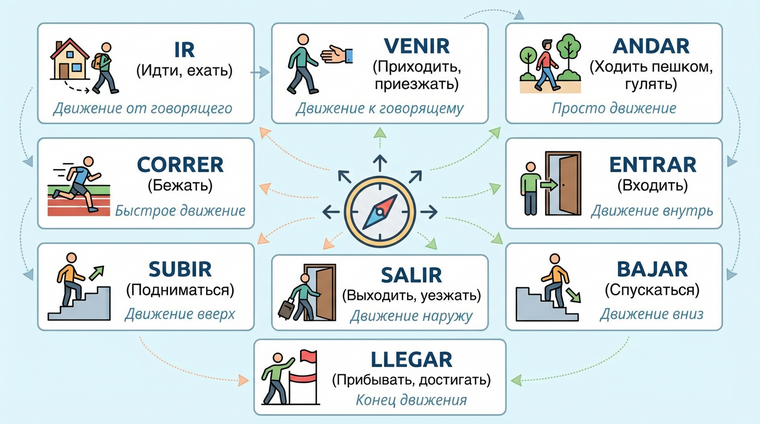 Эти восемь глаголов покрывают 90% ситуаций, связанных с передвижением. Остальные — вариации и уточнения. По данным Instituto Cervantes, глаголы ir, venir и salir входят в топ-20 самых употребляемых глаголов испанского языка, что подтверждает их критическую важность для коммуникации.