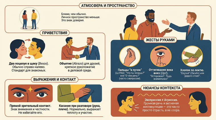 Если вы приехали из культуры, где прикосновение к малознакомому человеку равносильно нарушению границ, приготовьтесь к культурному шоку. Испанцы — одна из самых тактильных наций Европы. Прикосновения для них не просто допустимы, они необходимы для установления контакта и демонстрации расположения.