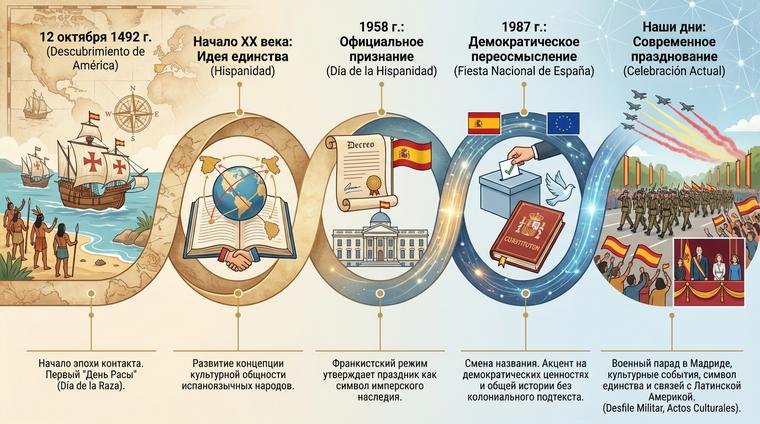 Изначально день назывался Día de la Raza (День Расы) — термин, который подчёркивал общность испаноязычных народов по обе стороны Атлантики. В 1918 году праздник официально закрепили в календаре. Франко, конечно, использовал его для укрепления национального единства и прославления имперского прошлого. После его смерти в 1987 году праздник переименовали в Fiesta Nacional de España (Национальный праздник Испании), убрав идеологическую нагрузку, но оставив военный парад.