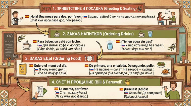 Представьте: вы входите в уютное кафе в сердце Барселоны или Мадрида, воздух пропитан ароматом свежесваренного кофе и хрустящих чуррос, а официант уже направляется к вам с меню. И вот тут начинается то самое неловкое молчание, когда вы понимаете, что знание слова "hola" не спасёт ситуацию. Заказ в кафе на испанском — это не просто набор фраз из разговорника, это маленький театр, где вы либо главный герой, либо турист, беспомощно тыкающий пальцем в меню. Хорошая новость: научиться делать заказ так, чтобы не выглядеть потерянным путешественником, проще, чем кажется. Плохая — без базовой подготовки вы рискуете получить не тот тапас и стать объектом снисходительных взглядов местных.