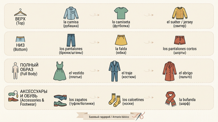 Представьте: вы стоите перед витриной мадридского бутика, хотите примерить ту самую кожаную куртку, но не знаете, как попросить другой размер. Или бродите по барселонскому рынку, где продавец расхваливает изящные туфли, а вы лихорадочно вспоминаете, как по-испански "каблук". Знание лексики одежды и обуви — это не просто расширение словарного запаса, это ключ к уверенному шопингу, комфортному путешествию и профессиональному общению в испаноязычной среде. Сегодня разберём всё — от базовых терминов гардероба до культурных нюансов, которые помогут вам не просто говорить, а говорить со вкусом 👔