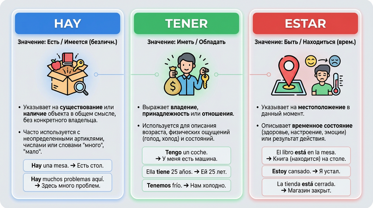 Запутались между "hay", "tener" и "estar"? Добро пожаловать в клуб начинающих испанистов, где каждый второй хотя бы раз говорил "Yo hay un libro" вместо "Yo tengo un libro". Эти три глагола — настоящая головная боль для новичков, потому что в русском языке их функции часто выполняет один и тот же глагол "есть" или "быть". Но испанцы, видимо, решили усложнить нам жизнь и разделили эти понятия на три отдельных глагола. Хорошая новость: разобравшись с ними один раз, вы получите мощный инструмент для построения базовых фраз. Плохая новость: придётся немного напрячь мозг. Готовы? Тогда давайте разбираться, когда какой глагол использовать, чтобы испанцы вас понимали, а не смотрели с недоумением.