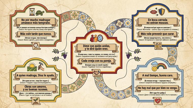 Представьте: вы впервые слышите фразу "A quien madruga, Dios le ayuda" — и вдруг понимаете, что это не просто слова о том, что Бог помогает тем, кто рано встаёт. Это целая философия жизни, закодированная в семи словах. Испанские пословицы — не музейные экспонаты, а живые инструменты коммуникации, которые испанцы используют каждый день: в офисах, на рынках, за семейным столом. Они отражают то, как нация думает о семье, труде, успехе и самой жизни. Если вы хотите по-настоящему понять испанский менталитет — забудьте учебники грамматики. Откройте сборник пословиц. Именно там, между метафорами и рифмами, спрятан ключ к душе целого народа 🔑