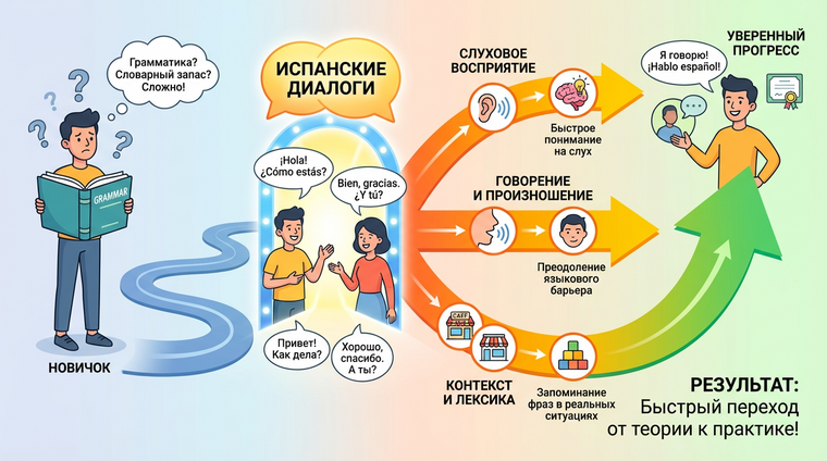 Давайте начистоту: грамматические упражнения — это важно, но невыносимо скучно. Вы можете выучить все времена глаголов, разобраться в сослагательном наклонении и даже запомнить разницу между "ser" и "estar", но всё это остаётся мёртвым грузом, пока вы не начнёте применять знания в живом общении. Именно диалоги превращают пассивный словарный запас в активный инструмент коммуникации.