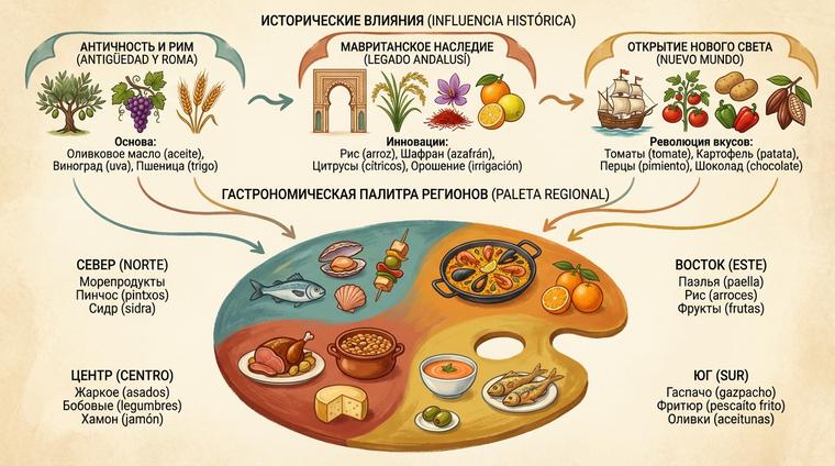 Испанская кухня — это результат многовекового культурного обмена, где каждая цивилизация оставила свой вкусовой след. Римляне принесли оливковое масло и виноград, вестготы — технологии копчения, а мавры в период с VIII по XV век обогатили испанский стол рисом, шафраном, миндалём и цитрусовыми. Именно благодаря арабскому влиянию появились сложные системы орошения, позволившие выращивать разнообразные овощи и фрукты на засушливых землях Иберийского полуострова.