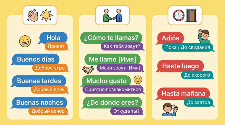 Приветствие — это первое впечатление, и в испаноязычной культуре оно имеет колоссальное значение. Испанцы здороваются громко, с улыбкой и часто с объятиями даже при первой встрече. Если вы промямлите что-то невнятное, вас поймут, но точно запомнят как "того странного иностранца". Поэтому начнём с фраз, которые создадут правильный настрой.