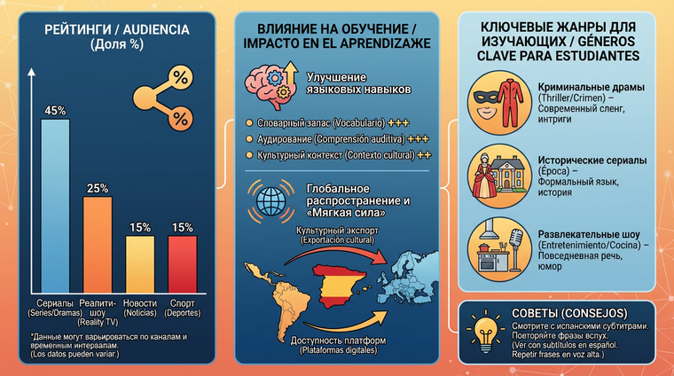 Испанское телевидение — это не просто развлекательные программы на фоне. Это культурный феномен, который формирует языковые тренды, диктует моду на эмоции и создаёт целые поколения фанатов по всему миру. Когда миллионы зрителей замирают перед экранами, следя за судьбой героев теленовеллы, или когда популярное шоу становится темой обсуждения в офисах и университетах — это уже не развлечение, а социальное явление. Если вы когда-нибудь пытались понять, почему испаноязычные сериалы так захватывают, или хотели использовать их для изучения языка, эта статья для вас. Здесь не будет воды и общих фраз — только конкретика, факты и практические инсайты от человека, который знает предмет изнутри.