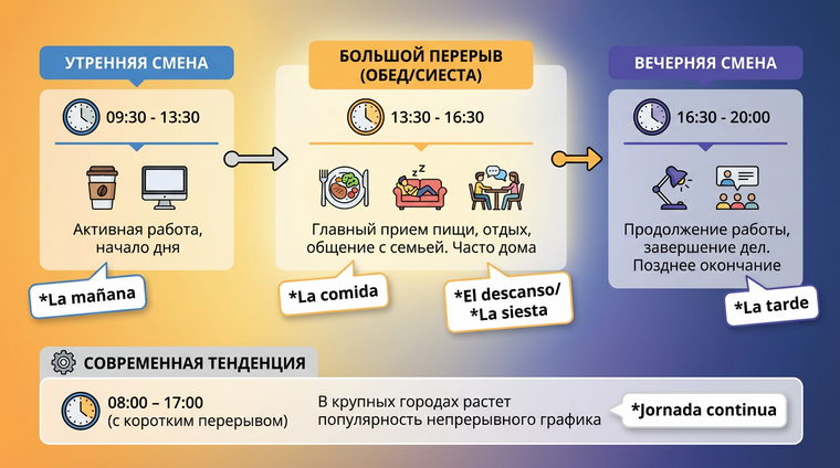 Испанский рабочий день — это не просто набор часов от и до. Это целая философия, построенная на принципе разделённого графика (jornada partida). Классический испанский офисный работник начинает день в 9:00-10:00, трудится до 14:00, затем уходит на обеденный перерыв длиной 2-3 часа и возвращается к работе в 17:00, завершая день около 20:00-21:00. Да, вы правильно прочитали — рабочий день может растянуться на 12 часов, хотя фактически отработанных часов обычно 8-9.
