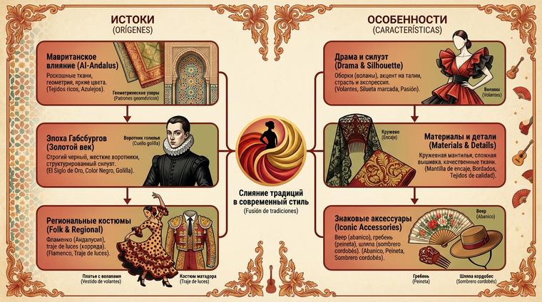 | XVIII—XIX века | Мантильи (mantillas), веера, расшитые шали | Романтизация испанского образа |