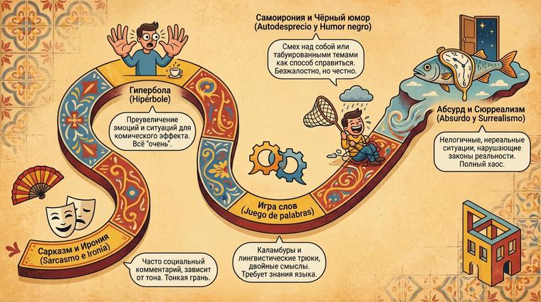 Латиноамериканский юмор отличается от испанского ещё сильнее. Мексиканцы обожают пикантные шутки и двусмысленности, аргентинцы славятся самоуверенным юмором с нотками превосходства, а колумбийцы предпочитают лёгкий, дружелюбный стиль. Исследование Института Сервантеса (2022) показало, что испанцы и латиноамериканцы понимают только 60–70% шуток друг друга из-за культурных и языковых различий.