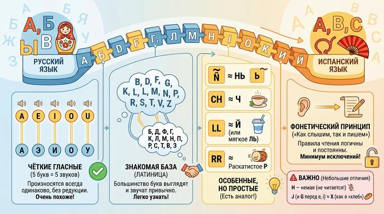 Испанский алфавит содержит 27 букв — всего на шесть меньше, чем в русском. Это первое приятное открытие для начинающих. Второе — фонетическая прозрачность языка. В отличие от английского, где одна буква может читаться пятью разными способами, испанский работает по принципу "что написано, то и произносится". Одна буква — один звук, никаких подвохов.