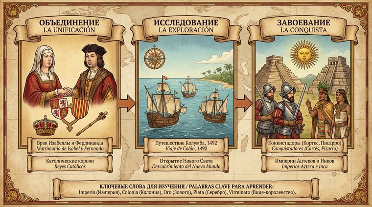 Всё началось в 1492 году — дата, которую каждый школьник знает благодаря Колумбу, но мало кто понимает её реальное значение. В том же году, когда Христофор Колумб ступил на берега Нового Света, католические монархи Фердинанд и Изабелла завершили Реконкисту, отвоевав Гранаду у мавров. Эта синхронность не случайна: Испания обрела территориальное единство и религиозную идентичность именно тогда, когда открылись врата к невиданному богатству Америки.
