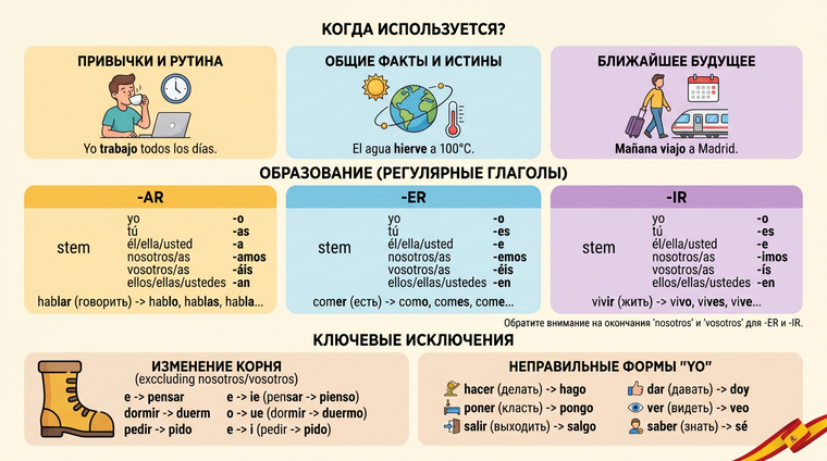 Presente de Indicativo — это настоящее время изъявительного наклонения, которое описывает действия, происходящие прямо сейчас, регулярные привычки или общие факты. По сути, это ваш главный инструмент для 80% повседневных разговоров. Говорите ли вы "работаю в офисе", "люблю паэлью" или "живу в Мадриде" — всё это Presente.