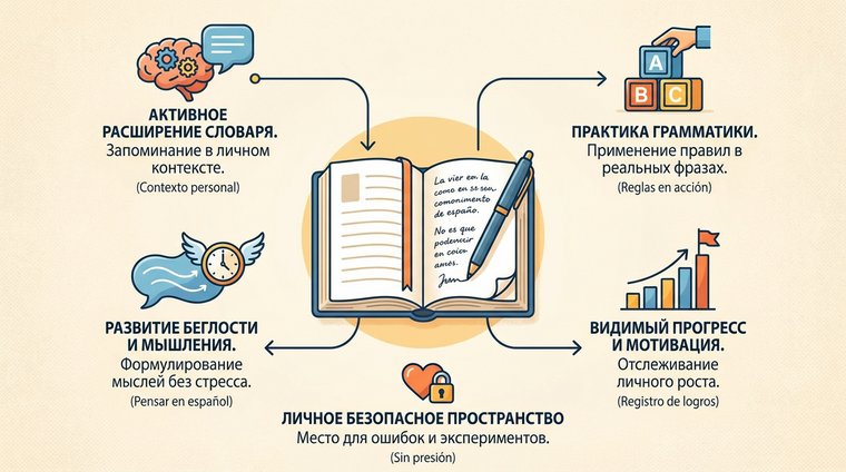 Дневник — это личный полигон для языковых экспериментов, где каждая запись приближает вас к свободному владению испанским. 🎯