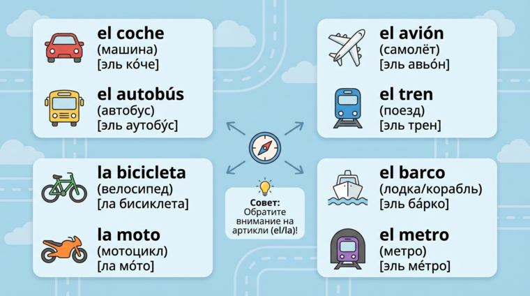 Начнём с фундамента. Если вы не знаете, как называется автобус по-испански, вам будет сложно его найти — логично, не правда ли? Транспортная лексика делится на несколько категорий: виды транспорта, места и действия. Запомните эти слова — они станут вашим спасательным кругом в любом испаноязычном городе.
