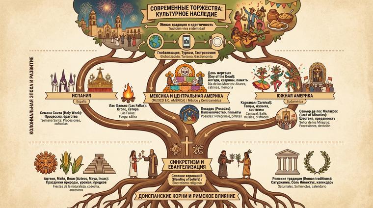 Католические праздники в испаноязычных странах — результат многовекового синкретизма, где христианские догматы наложились на языческие традиции иберийцев, вестготов, а позже — на верования коренных народов Америки. Когда испанцы принесли католицизм на завоёванные территории в XVI веке, они столкнулись не с чистым листом, а с развитыми религиозными системами ацтеков, майя, инков. Миссионеры быстро поняли: запретить локальные обряды невозможно, поэтому появилась стратегия "cristianización" — христианизации через адаптацию 🎭.