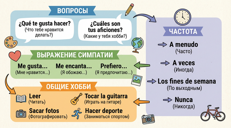Частотность занятий выражается через временные маркеры: todos los días (каждый день), a menudo (часто), de vez en cuando (время от времени), raras veces (редко). Комбинируйте их с основными фразами: Voy al gimnasio todos los días (Я хожу в спортзал каждый день) или De vez en cuando pinto acuarelas (Время от времени я рисую акварелью).