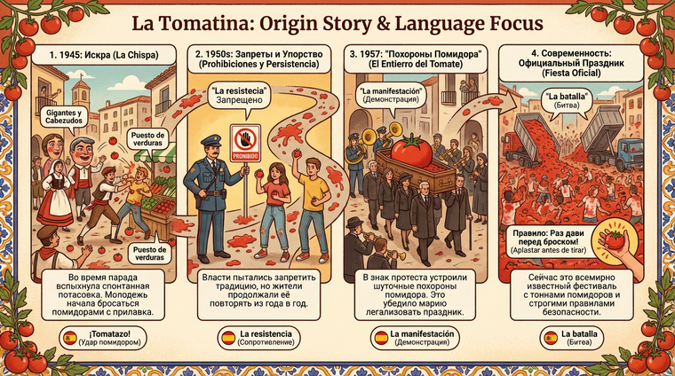 Ла Томатина — отличный повод расширить словарный запас испанского языка тематической лексикой, которую редко встретишь в учебниках. Знание этих слов не только поможет вам понять суть происходящего, но и добавит колорита в общение с местными жителями. Испанцы обожают, когда иностранцы пытаются говорить на их языке, особенно если речь идёт о таких безумных традициях 🎉.