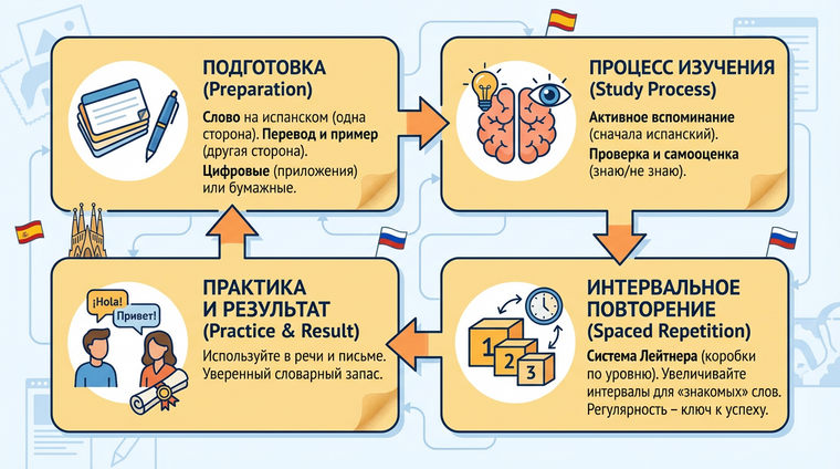 Флэш-карточки — это не волшебная палочка, а инструмент, эффективность которого зависит от того, как вы его используете. Создавайте карточки осмысленно, повторяйте системно, экспериментируйте с приложениями и играми — и ваш испанский словарный запас перестанет быть слабым местом. Главное: постоянство бьёт интенсивность. Лучше 10 минут каждый день, чем три часа раз в неделю. Теперь у вас есть все инструменты — дело за практикой. ¡Adelante! 🚀