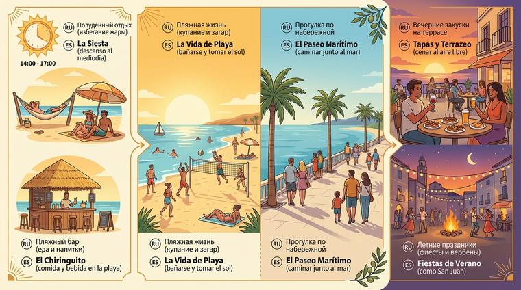 Ритуал начинается ещё в июне, когда семьи планируют маршруты. Многие испанцы арендуют apartamentos (квартиры) на всё лето в прибрежных городках вроде Салоу или Бенидорма. Типичный день летнего отдыха выглядит так: