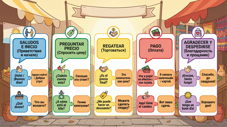 Рынок — это место, где испанский звучит быстро, громко и без церемоний. Здесь не будут ждать, пока вы вспомните правильное спряжение глагола. Поэтому запоминайте ключевые фразы наизусть, как таблицу умножения.