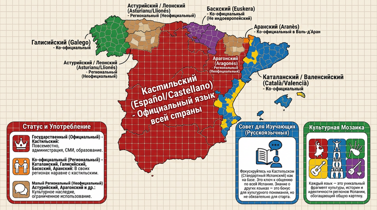 Испания — это не просто страна фламенко и корриды, это лингвистическая головоломка, где на территории одного государства уживаются четыре официальных языка и десяток диалектов. Забудьте о стереотипе «все говорят по-испански» — здесь вас могут не понять даже в соседнем регионе. Каталонцы отстаивают свой язык с упорством матадора, баски хранят эускера как священную реликвию, а галисийцы напоминают, что их язык — не португальский диалект. Языковая идентичность в Испании — это не просто вопрос грамматики, это политика, история и страсть, замешанные на гордости поколений. 🇪🇸