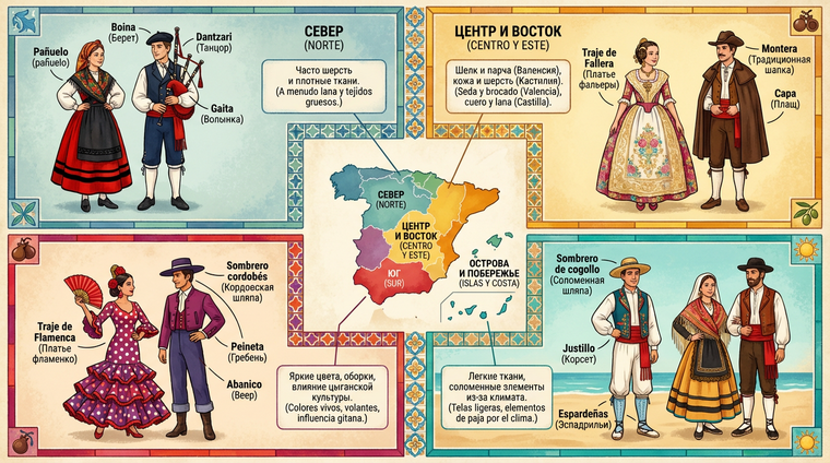 В основе регионального разнообразия лежат три фактора: география, история и — внезапно — политика. Горные районы породили тёплые шерстяные костюмы с обилием слоёв, средиземноморское побережье предпочло лёгкие ткани и яркие цвета, а внутренние равнины Кастилии выработали строгий, почти аскетичный стиль. Арабское влияние на юге, римское наследие в центре, кельтские корни на севере — всё это читается в крое и орнаментах.
