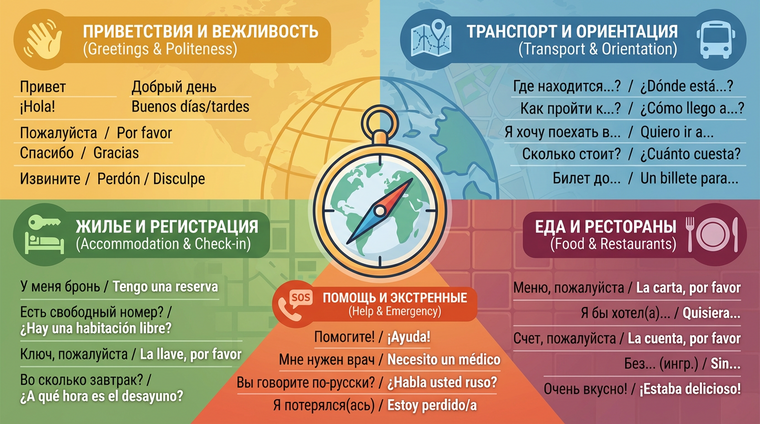 Прилетаете в Барселону, выходите из аэропорта, ловите такси — и тут водитель заговаривает по-испански так быстро, что вы понимаете: гугл-переводчик вас не спасёт. 🌍 Знакомо? Путешествие превращается из приключения в квест на выживание, если вы не знаете базовых фраз. Хорошая новость: для комфортного перемещения по испаноязычным странам достаточно пары десятков выражений. Плохая — эти выражения нужно знать уверенно, произносить чётко и понимать, когда какое использовать. В этой статье разберём реальные ситуации, в которые попадает каждый турист, и дадим вам готовый языковой инструментарий для отелей, ресторанов, магазинов и даже экстренных случаев. Без воды, без банальностей — только то, что работает на практике.