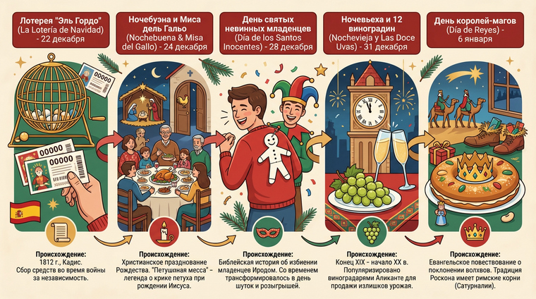 Истоки современных новогодних традиций в Испании формировались на протяжении веков под влиянием католической церкви, региональных обычаев и даже… коммерческих интересов. Да-да, не удивляйтесь: некоторые из самых "древних" традиций на деле появились относительно недавно. Например, знаменитый ритуал с виноградом, о котором мы поговорим отдельно, обрел массовую популярность лишь в начале XX века благодаря находчивым виноградарям Леванте, которым нужно было сбыть урожай 🍇