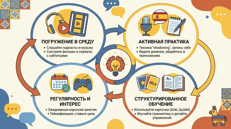 И не забывайте про голосовые заметки. Записывайте короткие аудио на испанском в телефоне: рассказ о прошедшем дне, впечатления от книги, мысли о чём угодно. Потом прослушайте, проанализируйте ошибки, запишите заново. Это как письменный дневник, только устный. Через месяц у вас будет целая коллекция записей, по которым можно отследить прогресс. А ещё это отличный способ побороть страх собственного голоса на иностранном языке — да, такое тоже бывает. 🎙️