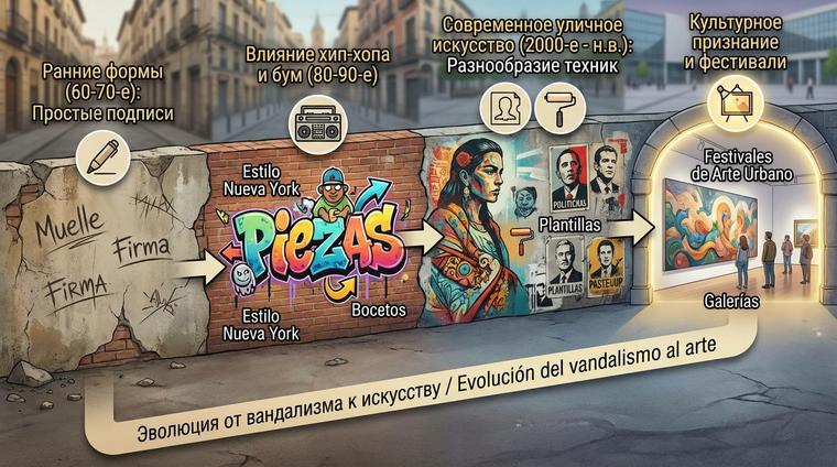| 1990-е | Развитие стилей, появление crew (команд), первые мурали | Валенсия, Севилья, Барселона |