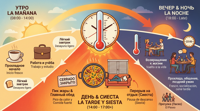 | 14:00-17:00 | 35-42°C (пик) | Сиеста, обед дома |