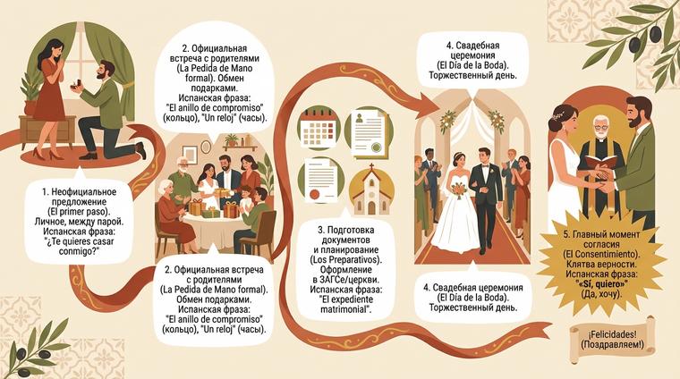 Помню, как моя подруга Елена выходила замуж за испанца из Севильи. Когда её будущий муж Хавьер впервые пришёл просить её руки у родителей, мы все думали, что это будет формальностью — ну знаете, как в фильмах, пять минут разговора и «да-да, конечно». Оказалось, что его родители приехали целой делегацией: мама, папа, две тёти и даже бабушка! Они привезли с собой старинный золотой браслет, который передавался в их семье четыре поколения, бутылку хереса 30-летней выдержки и коробку с тринадцатью золотыми монетами, завёрнутыми в кружевной платок. Отец Хавьера произнёс речь минут на пятнадцать о том, как он ценит русскую культуру и как рад породниться с нашей семьей. Мы сидели, затаив дыхание, а потом устроили такой праздник, что соседи присоединились! Вот тогда я поняла: для испанцев помолвка — это не просто согласие пожениться, это объединение двух родов, почти как договор между королевскими династиями.