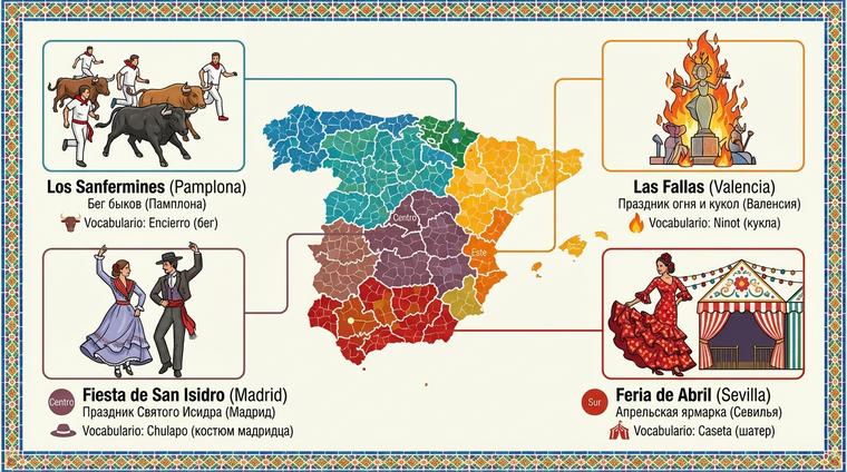 Испания — это не просто страна фламенко и корриды, это живой организм из семнадцати автономных регионов, где каждый праздник звучит на своём диалекте и пахнет по-своему. Если вы думаете, что выучили испанский по учебнику — забудьте. Настоящий язык живёт на улицах Севильи во время Семана Санта, в томатных баталиях Валенсии и на гастрономических фестивалях Страны Басков. Здесь каждый карнавал — это не просто повод надеть костюм, а возможность погрузиться в лингвистический калейдоскоп, где кастильский соседствует с каталанским, а галисийский спорит с баскским. Я расскажу вам, как превратить путешествие по испанским праздникам в мастер-класс по аутентичному языку — без скучных учебников и с морем эмоций 🎭