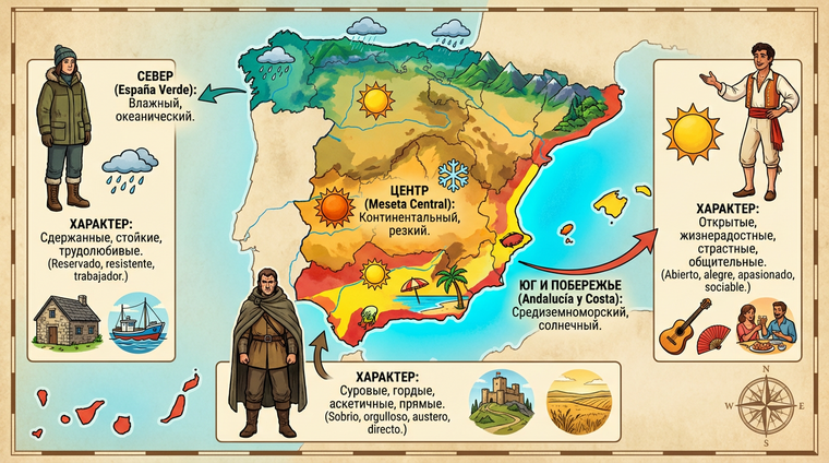 Юг — полная противоположность. Андалусия, Мурсия, Валенсия — это Средиземноморье и субтропики. Здесь 300 солнечных дней в году, температура летом легко перешагивает +35°C, а влажность низкая. Засушливость формирует открытость: жизнь идёт на улицах, в патио, на площадях. Южане экстравертны, громкоголосы, легко идут на контакт. Clima hace carácter — климат создаёт характер, говорят испанцы, и это не метафора.