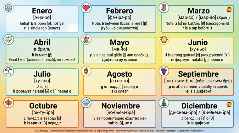 Испанские месяцы похожи на русские и английские — все они происходят от латыни. Но есть нюансы, которые сразу выдают новичка: неправильное ударение, мягкость согласных или забытая буква. Давайте разберём каждый месяц с точки зрения произношения и грамматики.
