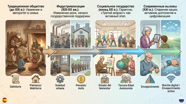 Переход к демократии после 1975 года запустил стремительную модернизацию. Урбанизация, эмансипация женщин, распад традиционных семейных структур — всё это могло бы привести к маргинализации пожилых, как это произошло во многих западных странах. Но Испания выбрала другой путь. Вместо того чтобы отодвинуть стариков на периферию общества, испанцы адаптировали традиции под новые реалии.