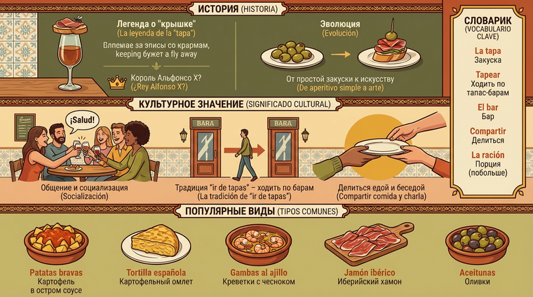 История тапас окутана легендами. Одна из самых популярных версий гласит, что король Альфонсо X Мудрый в XIII веке приказал подавать вино в тавернах исключительно с едой, чтобы посетители не пьянели слишком быстро. Кусочек хлеба или ломтик хамона клали прямо на бокал — «tapar» по-испански значит «накрывать». Отсюда и название. По другой версии, в Андалусии бармены накрывали бокалы крышечками из хлеба или сыра, чтобы в вино не попадали мухи и пыль — практично и вкусно. 🍇