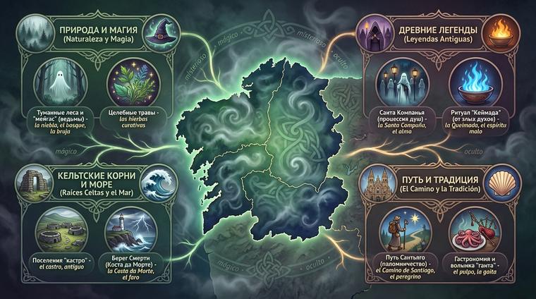 Галисийский фольклор насыщен персонажами, которых не встретишь в остальной Испании. Здесь обитают меиги (meigas) — ведьмы, которые могут быть как добрыми, так и злыми, траснос (trasnos) — озорные домовые, моуры (mouros) — волшебные существа, охраняющие древние сокровища. Фраза "Eu non creo nas meigas, mais habelas hainas" (Я не верю в ведьм, но они есть) стала народной мудростью, отражающей двойственное отношение галисийцев к сверхъестественному.