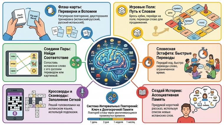 Забыли испанское слово прямо в разгаре разговора? Учили-учили вчера целый список, а сегодня в голове пусто? Знакомо? Проблема не в вашей памяти — проблема в методе. Зубрёжка работает ровно до момента, когда вы закрываете учебник. А вот игры и упражнения, построенные на ассоциациях, повторении в контексте и эмоциональной вовлечённости, внедряют слова в долгосрочную память так, что вы их вспомните даже спросонья. В этой статье я, как преподаватель с багажом реальных кейсов, расскажу, какие игры реально работают, а какие — пустая трата времени. Без воды, с примерами и конкретикой. Поехали 🚀