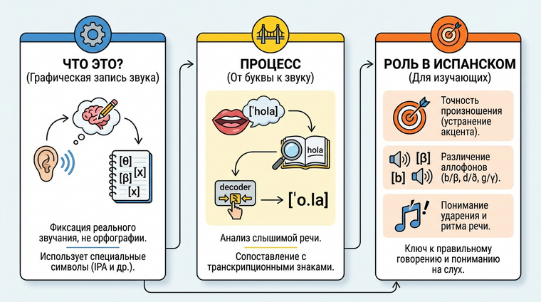 Транскрипция — это письменное отображение звучания слова с помощью специальных символов, чаще всего Международного фонетического алфавита (IPA). Если орфография показывает, как пишется слово, то транскрипция — как оно звучит на самом деле. Для испанского языка это особенно важно, потому что графика и произношение не всегда совпадают один к одному.