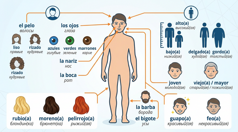 Цвет волос по-испански: rubio/rubia (блондин/блондинка), moreno/morena (брюнет/брюнетка, также используется для смуглых людей), pelirrojo/pelirroja (рыжий/рыжая), castaño (каштановый), canoso/canosa (седой/седая). Интересный факт: в Испании слово moreno имеет двойное значение — и тёмные волосы, и смуглая кожа, что иногда создаёт забавную путаницу для изучающих язык. 📚