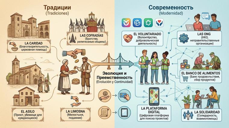 Современное испанское волонтёрство — это профессиональная деятельность с чёткими стандартами и требованиями. Организации предоставляют обучение, страховку и даже компенсируют расходы волонтёров. Никакой романтики девятнадцатого века — только конкретные цели, измеримые результаты и системный подход. 📊