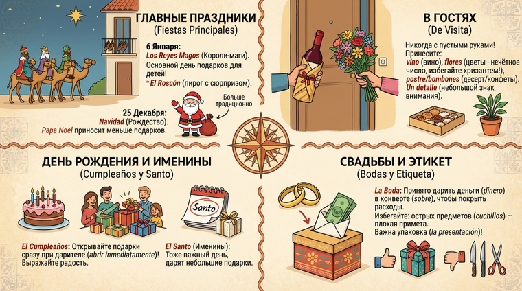 И помните: в Испании принято открывать подарок сразу в присутствии дарителя (кроме деловых ситуаций), выражая эмоции и благодарность. Откладывание подарка в сторону без открытия может быть воспринято как незаинтересованность. 🎁