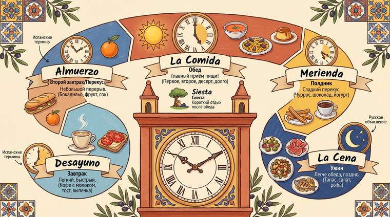 Испанский режим питания — это результат многовековых традиций, климатических условий и культурного подхода к жизни. В отличие от трёхразового питания, к которому привыкли многие европейцы, испанцы предпочитают растягивать удовольствие на пять приёмов пищи. И да, они действительно ужинают в десять вечера — это не миф, а суровая реальность, с которой сталкивается каждый турист 😊
